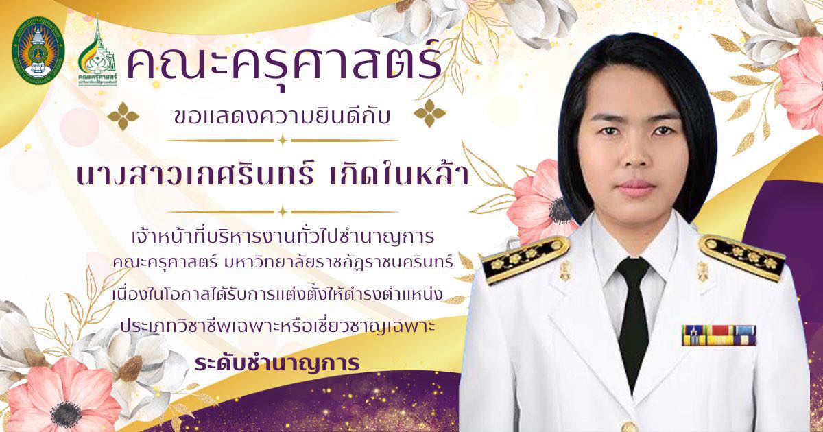 คณะครุศาสตร์ ขอแสดงความยินดีกับ นางสาวเกศรินทร์ เกิดในหล้า เจ้าหน้าที่บริหารงานทั่วไป ชำนาญการ